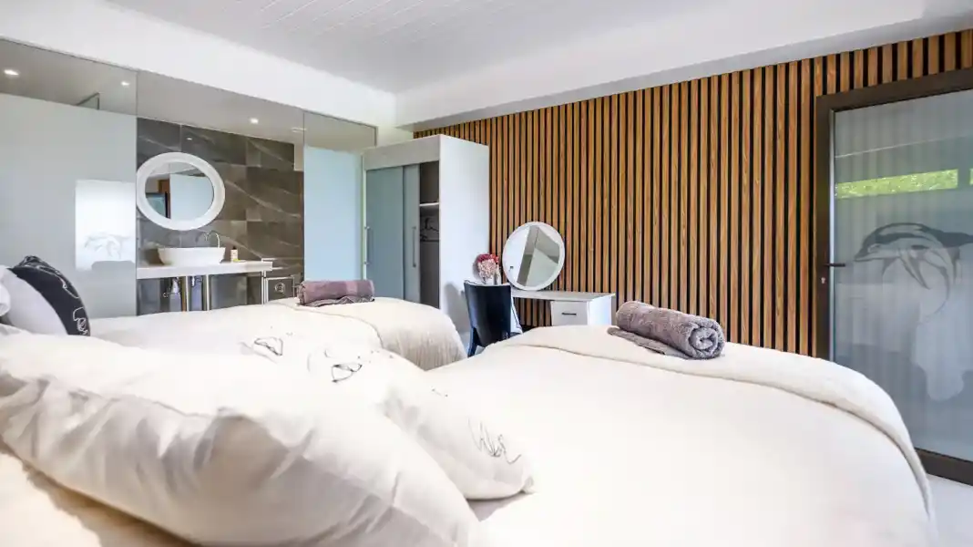 Guests can enjoy two separate living areas, both air-conditioned for year-round comfort. The main lounge includes a TV and an indoor braai — ideal for relaxed evenings. The second entertainment room features a pool table and an additional TV, creating the perfect space for fun and unwinding.